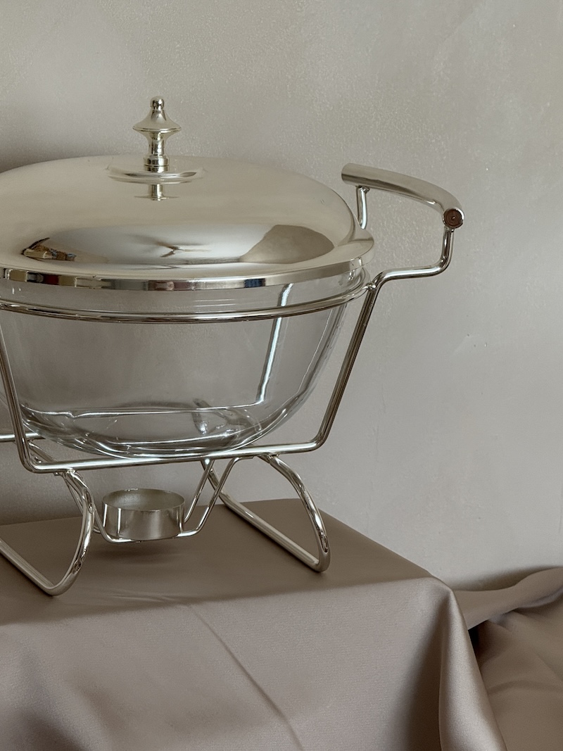 מכסה בסיס וידיות בציפוי כסף  וכלי זכוכית עמוק.